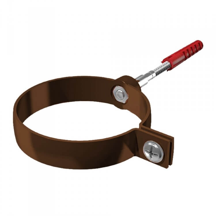 Хомут трубы ТЕХНОНИКОЛЬ металлический Пластик коричневый – элемент водосточной системы, которая устанавливается на скатных кровлях. Используется, чтобы закрепить трубу на нужном расстоянии от фасада. Размер – 140 мм.